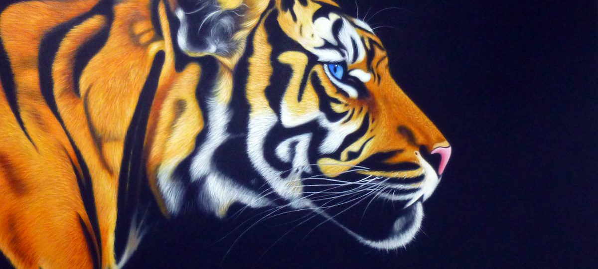 Profile of a tiger on a black background drawn using a canvas horizontally. Size 130 x 200 cm Check out other tiger paintings. Go to top page. Related workSumatran tiger with olive green eyesWhite tigerWhite tiger